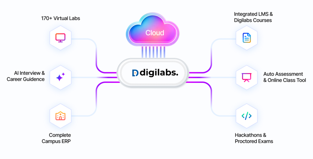 We help institutions embrace the future with Industry 5.0 readiness, empowering students with human-centric, sustainable, and AI-driven skills. Digilabs is your one-stop solution for cutting-edge digital lab solutions, virtual Centers of Excellence (VCoEs), and AI-driven career readiness.